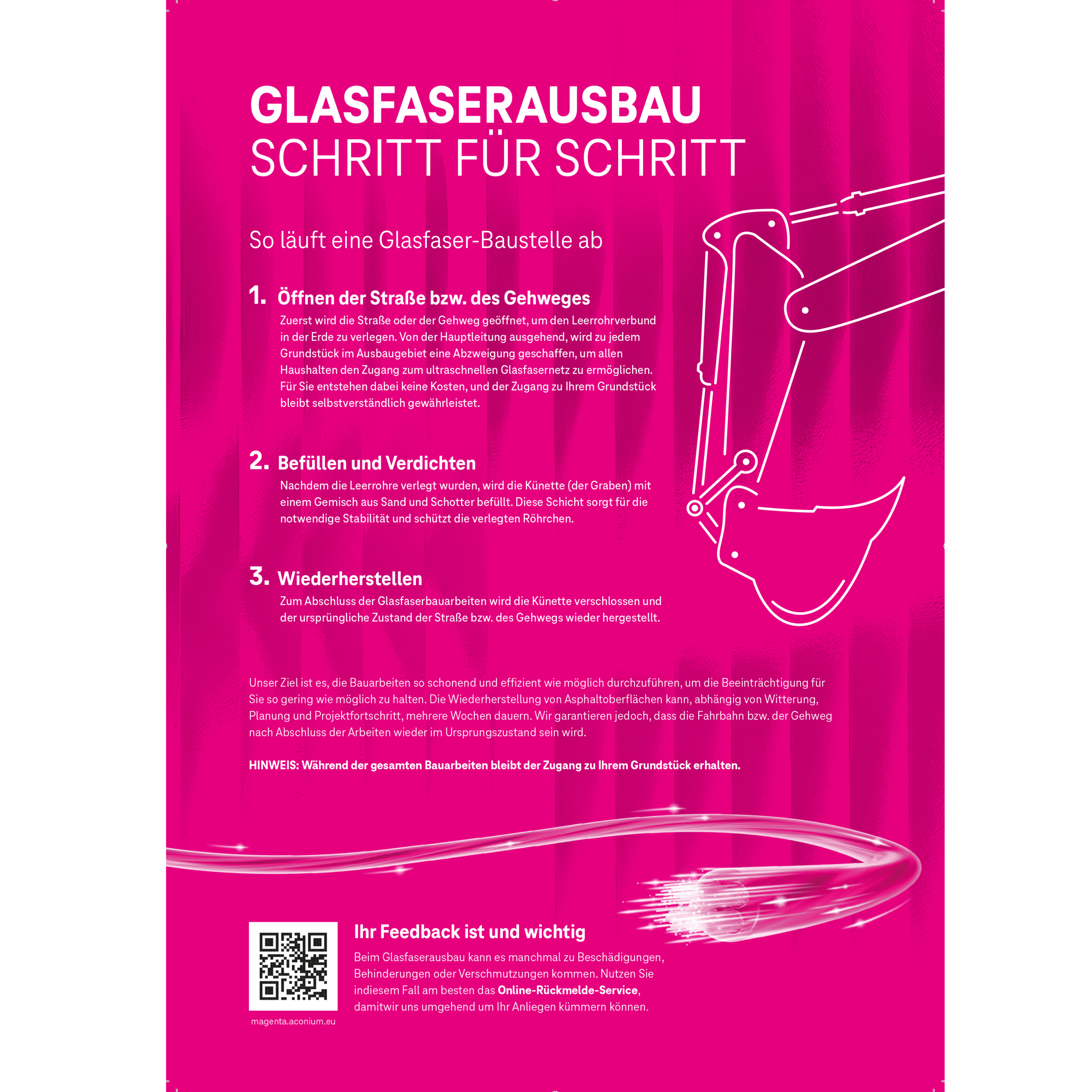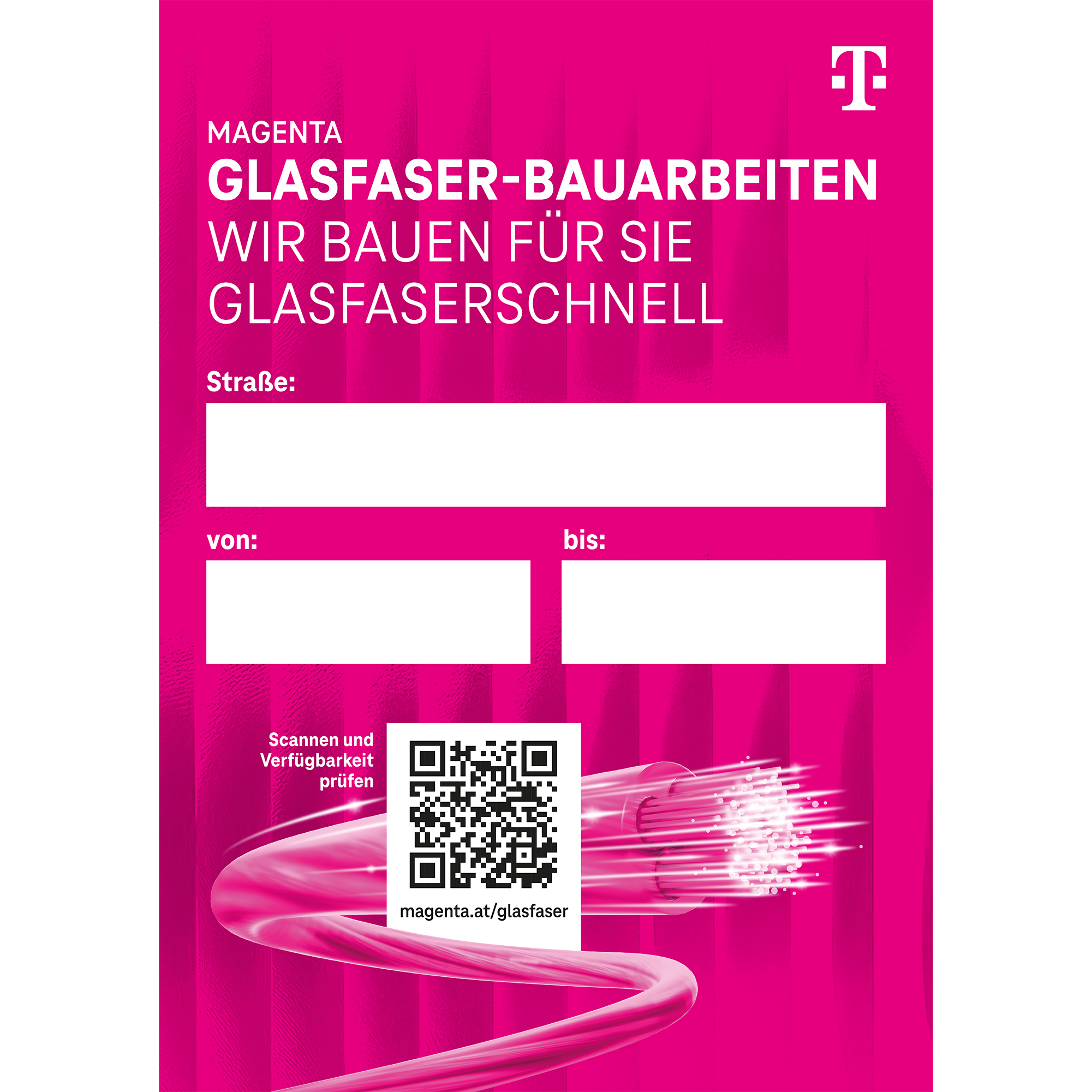 Aushang zu geplanten Magenta‑Glasfaserbauarbeiten mit Feldern für Straße und Zeitraum sowie QR‑Code zur Verfügbarkeitsprüfung. Auch als Plakat/Flyer verfügbar.