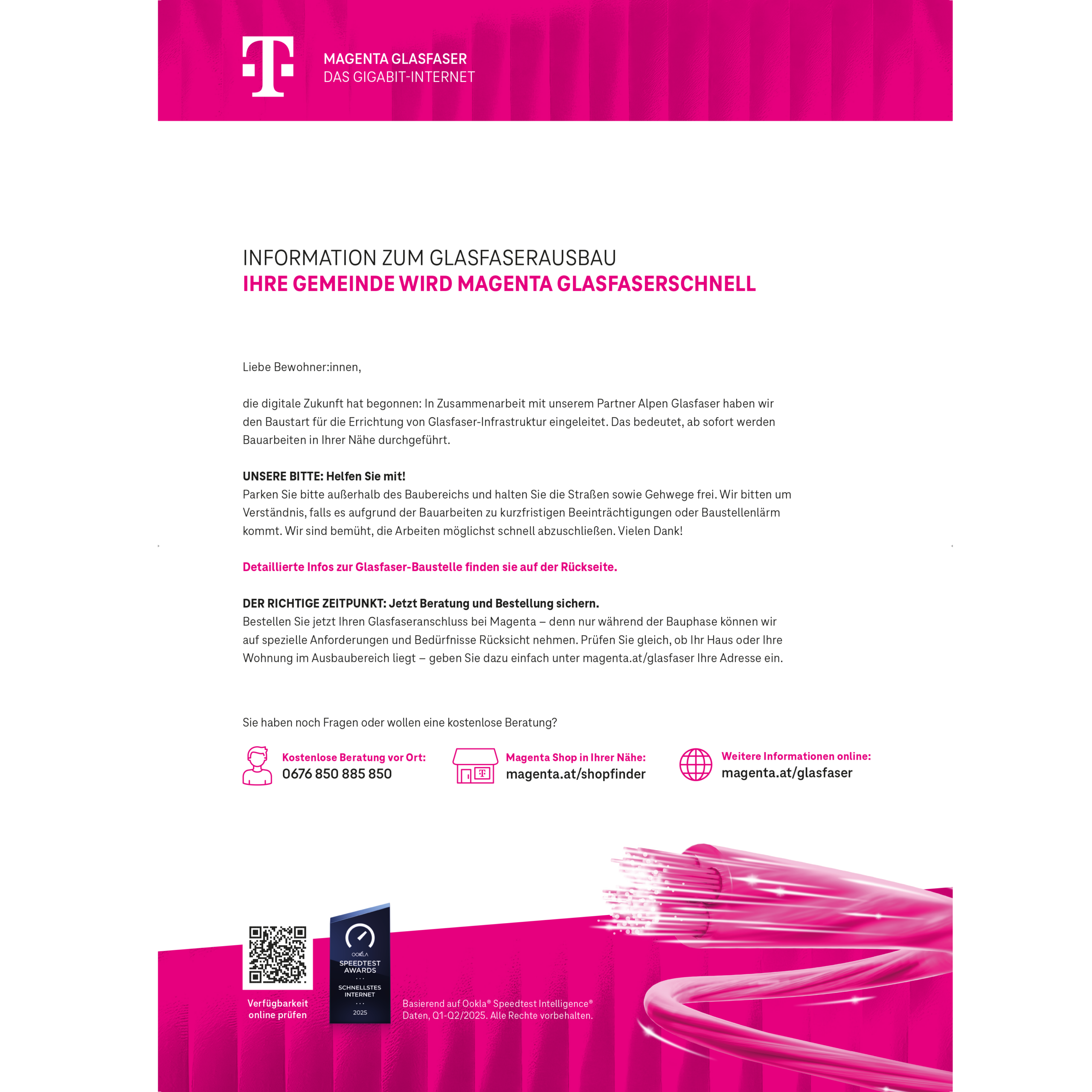 Infoblatt zum Glasfaserausbau in der Gemeinde. Informiert über Baustart, notwendige Hinweise für Anrainer:innen, Ablauf der Bauarbeiten und Kontaktmöglichkeiten für Beratung und Rückmeldungen.