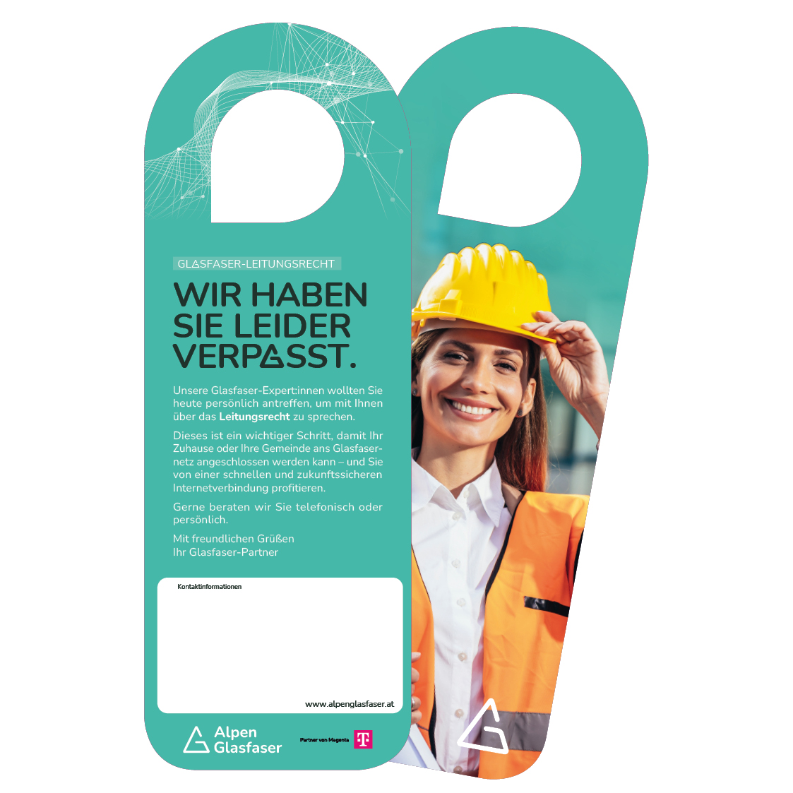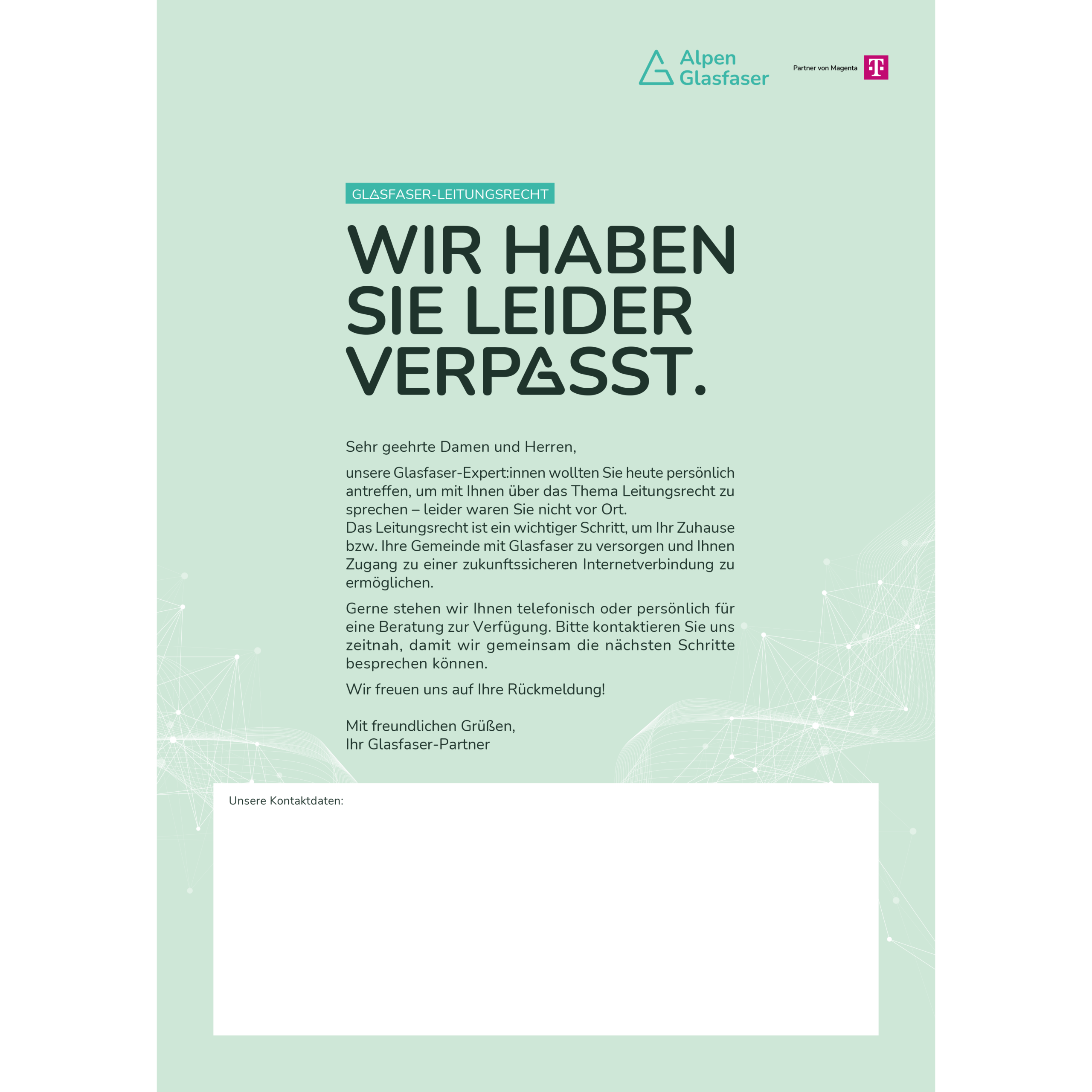 Flyer „Wir haben Sie leider verpasst.“ zum Hinterlassen bei nicht angetroffenen Kund:innen. Inhalt: Hinweis zum Leitungsrecht und Aufforderung zur Kontaktaufnahme.