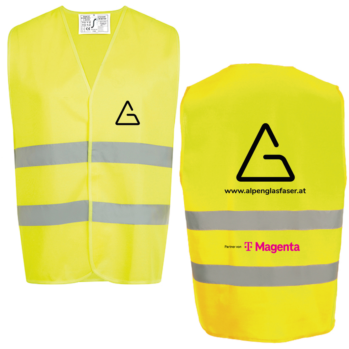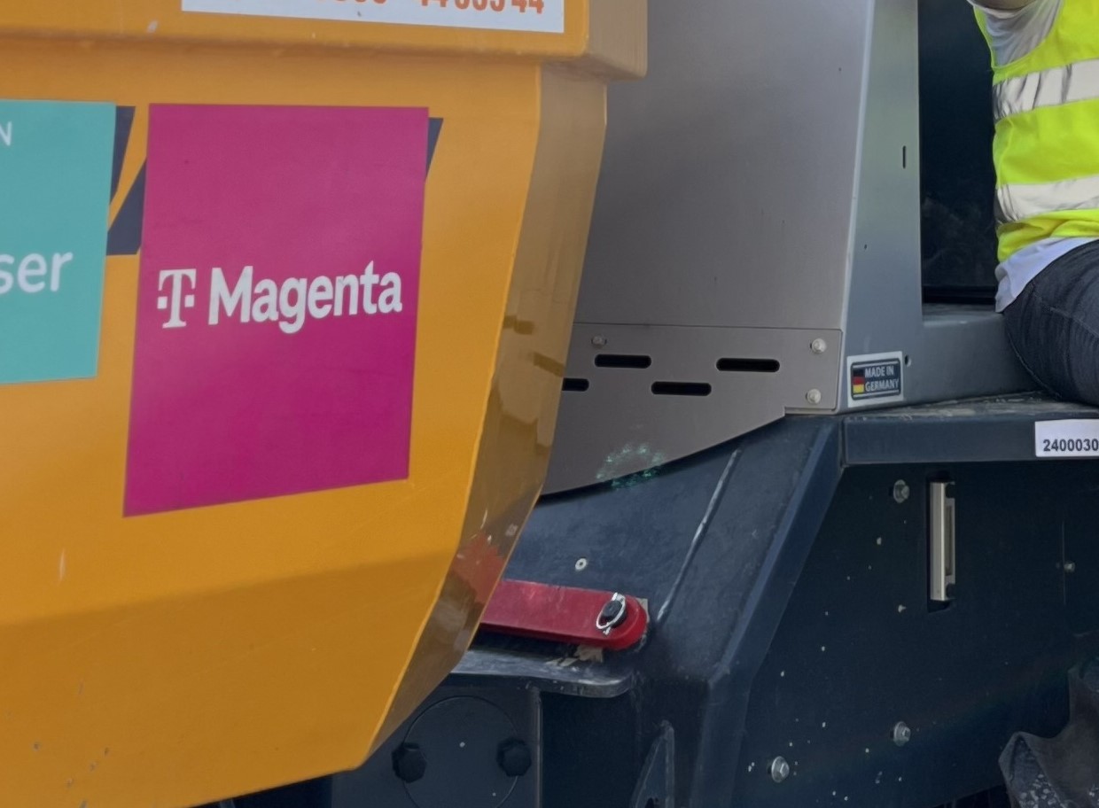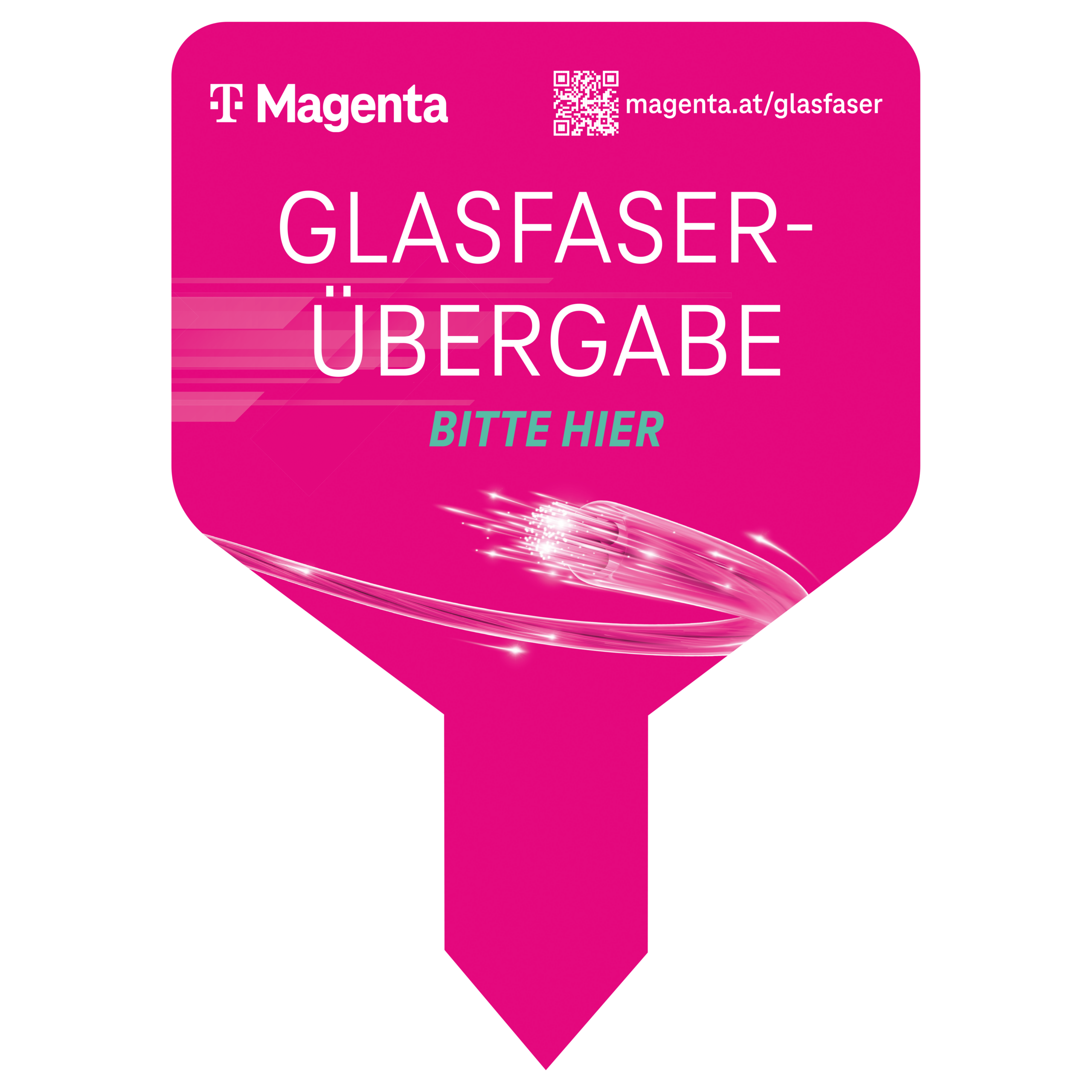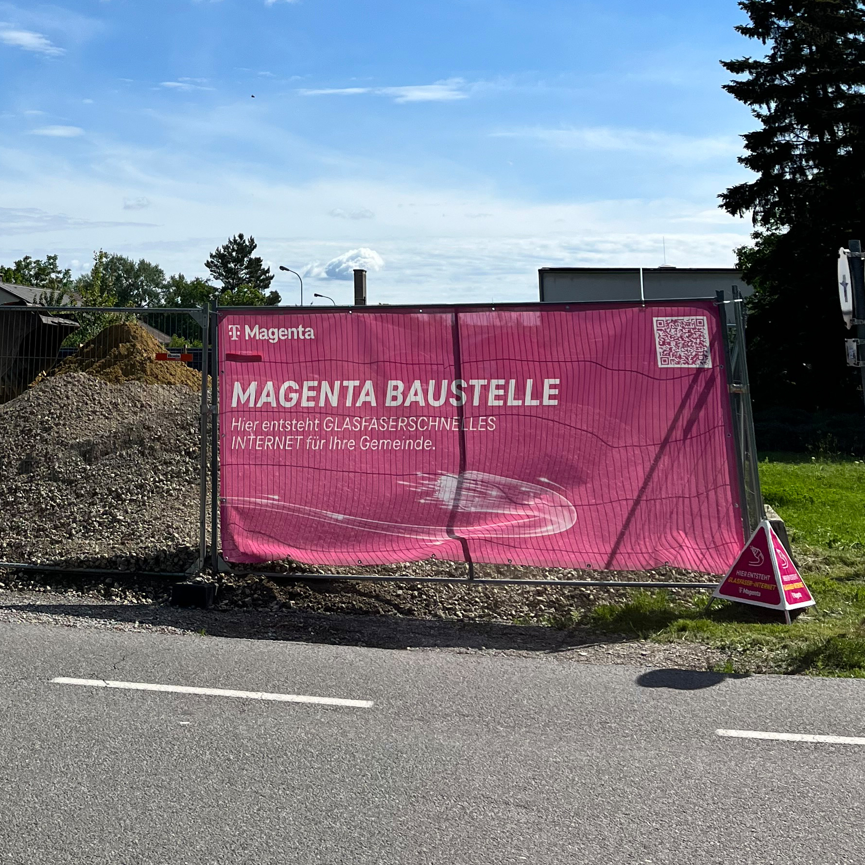 Bauzaunbanner für Magenta‑Glasfaserbauarbeiten. Signalisiert klar und gut sichtbar, dass in der Gemeinde ein Glasfaseranschluss errichtet wird. Erhältlich in den Formaten 340 × 170 cm und 200 × 90 cm.