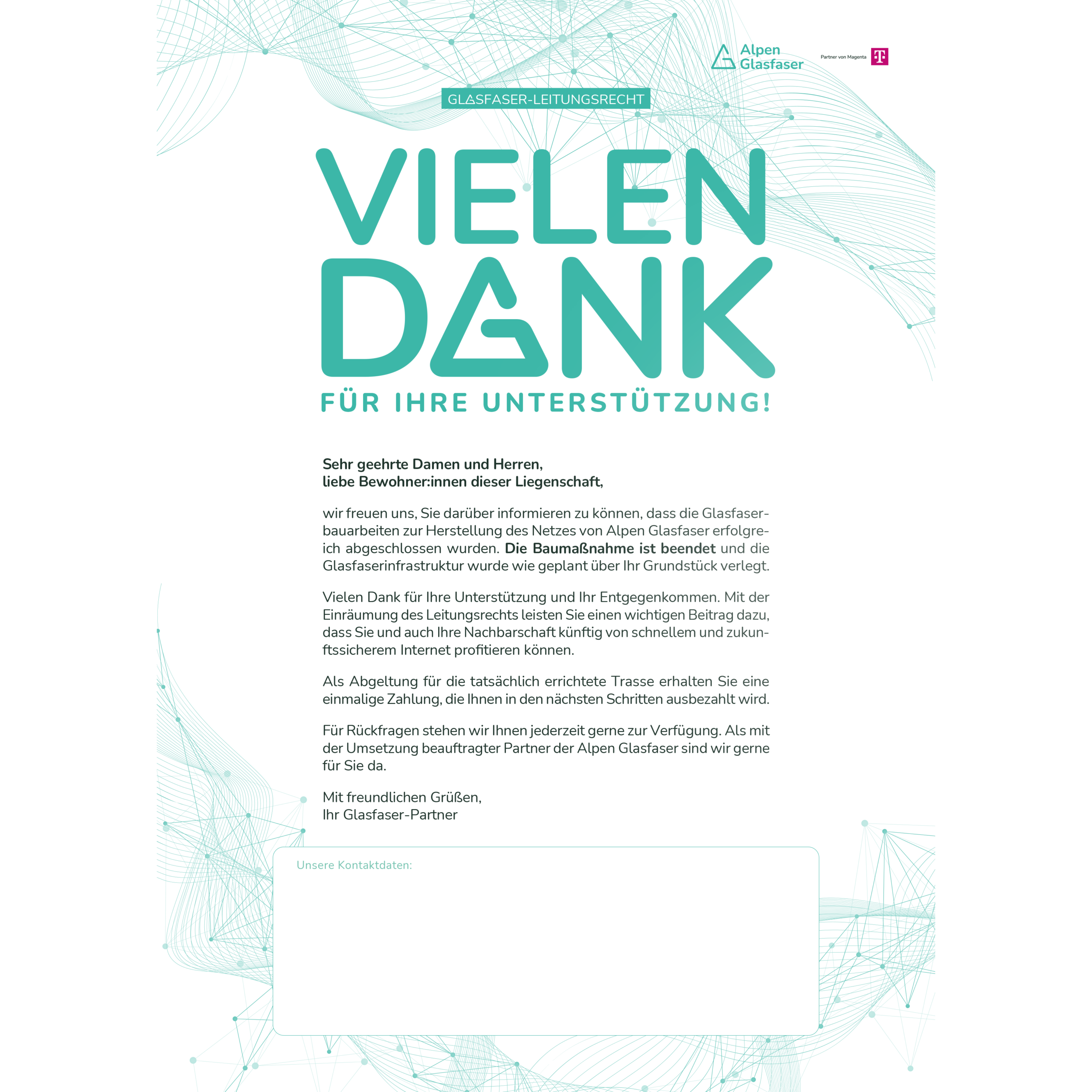 Flyer zur Information nach Abschluss der Glasfaserbauarbeiten. Enthält Dank für die Unterstützung, Hinweise zur fertiggestellten Trasse und zur bevorstehenden Auszahlung der Abgeltung.
