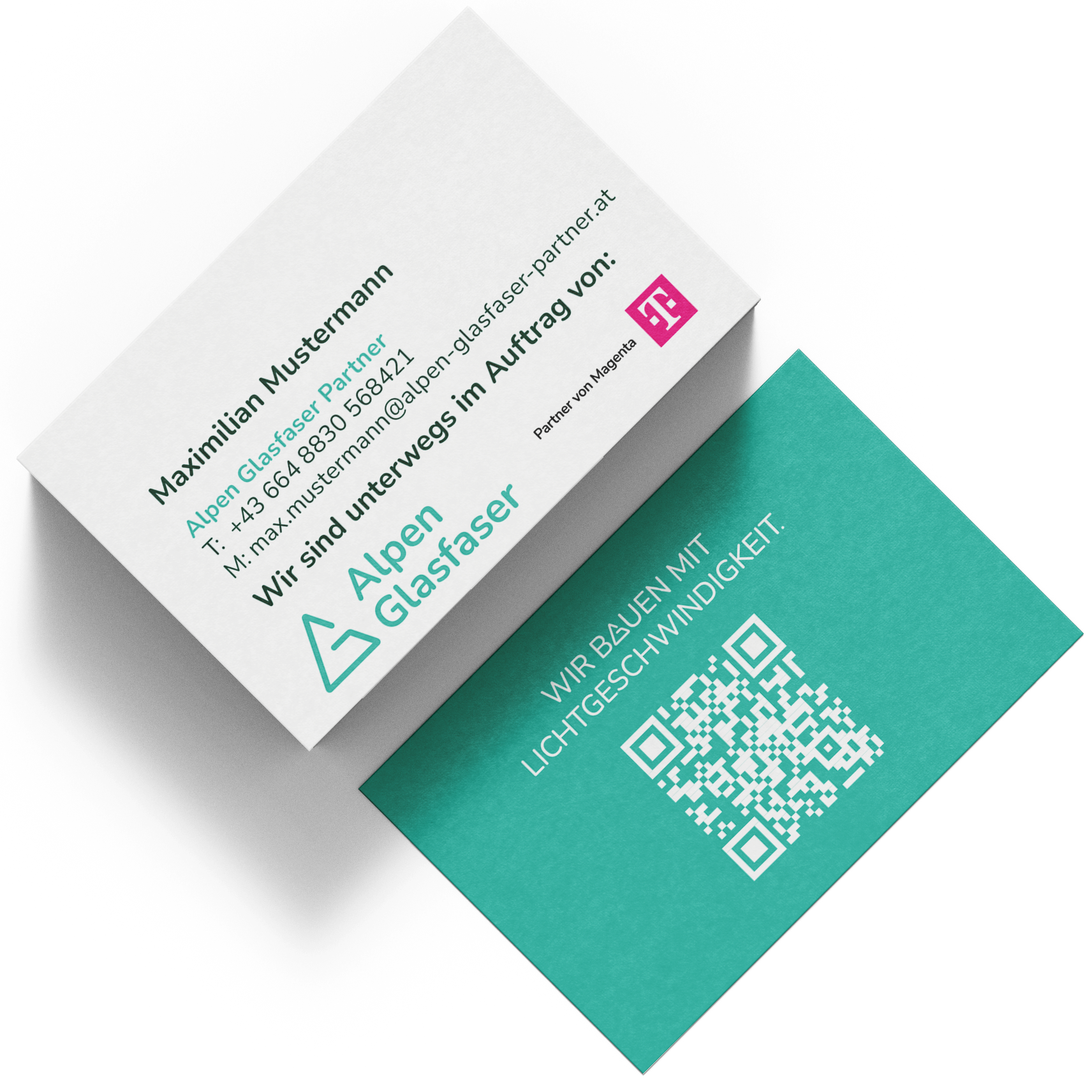 Personalisierte Visitenkarten im Alpen‑Glasfaser‑Design für Außendienst, Beratung und Kundentermine. Enthalten Name, Funktion und Kontaktdaten für ein einheitliches, professionelles Auftreten.
