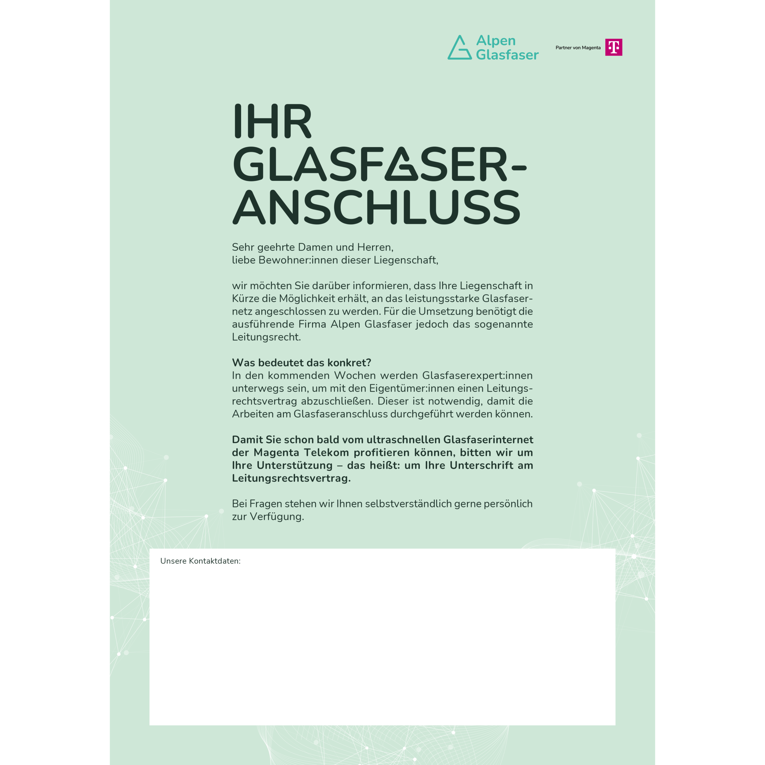 Aushang zur Vorankündigung des Glasfaseranschlusses. Informiert Bewohner:innen über den bevorstehenden Ausbau, das benötigte Leitungsrecht und die Kontaktaufnahme mit der ausführenden Firma.
