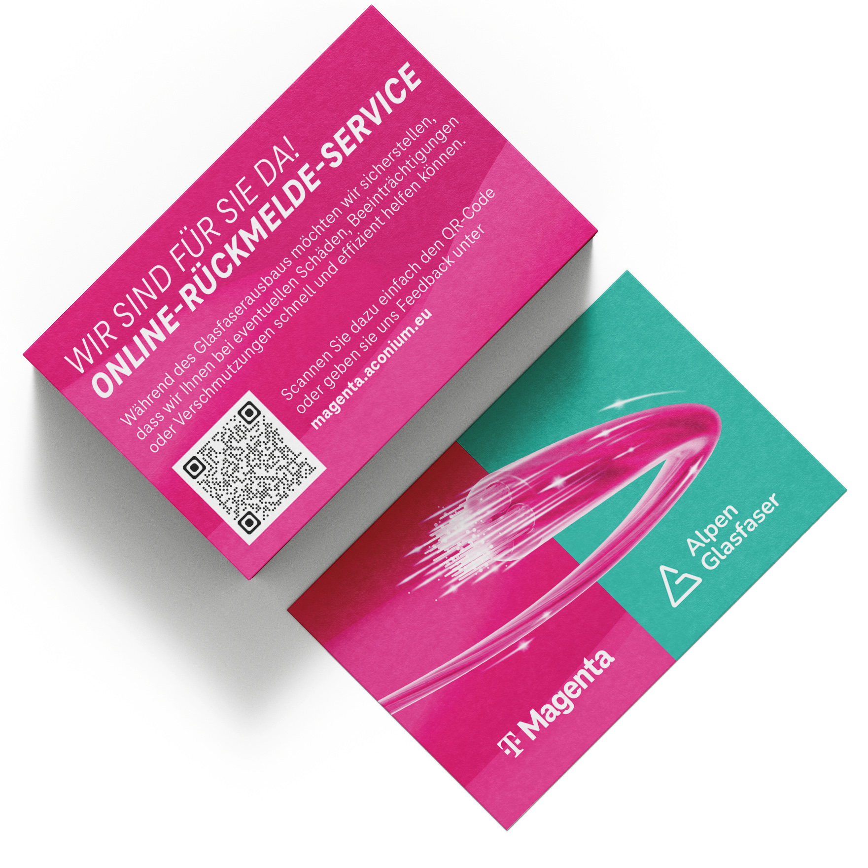 Karte für das Magenta‑Rückmeldeservice zur schnellen Meldung von Schäden, Beeinträchtigungen oder Verschmutzungen während der Glasfaserbauarbeiten. Enthält QR‑Code und Link für direkte Rückmeldung.