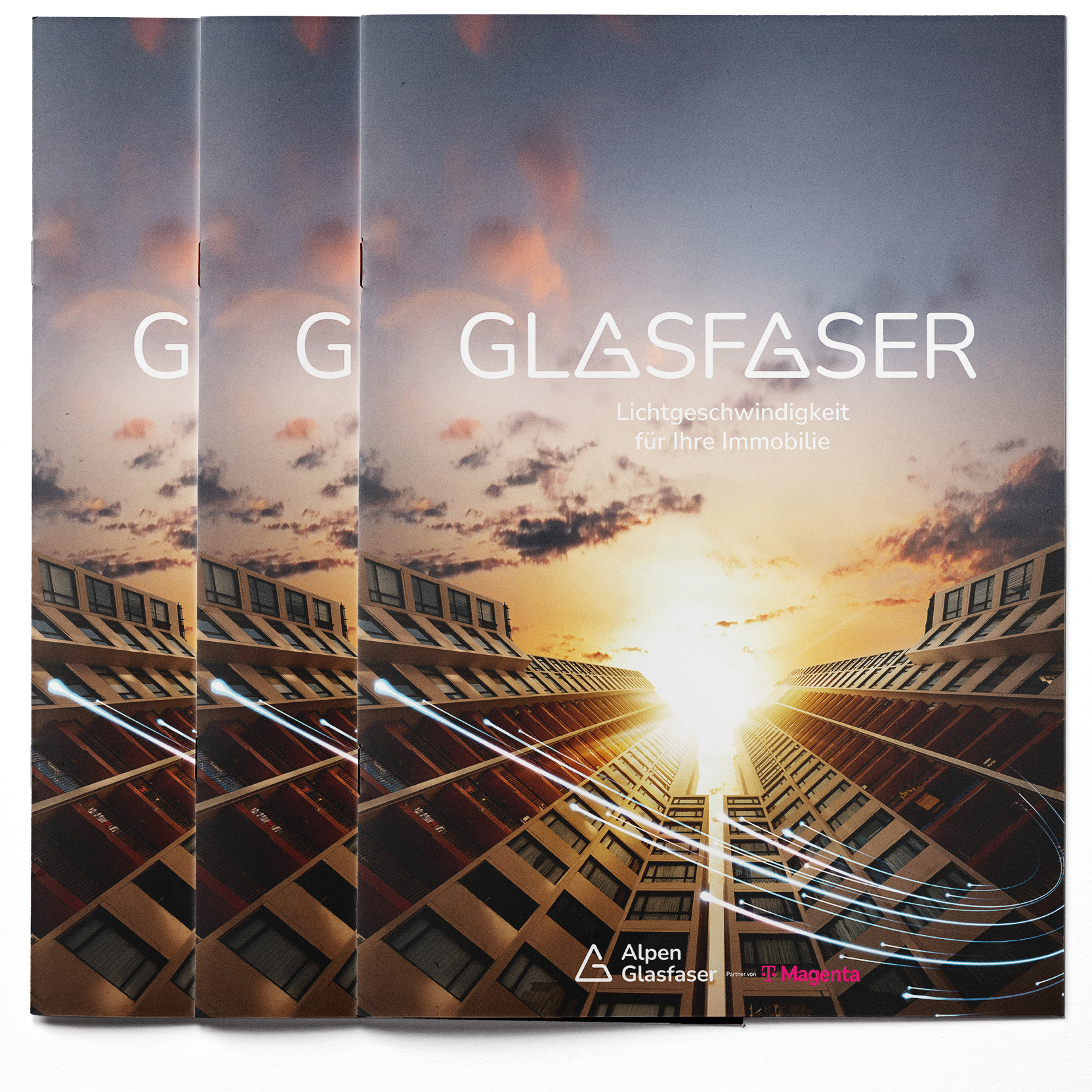 Broschüre für Mehrparteienhäuser zum Glasfaseranschluss durch Alpen Glasfaser und Magenta. Enthält Informationen zu Vorteilen, Ablauf, Leitungsrecht, Technik und Kontaktmöglichkeiten.