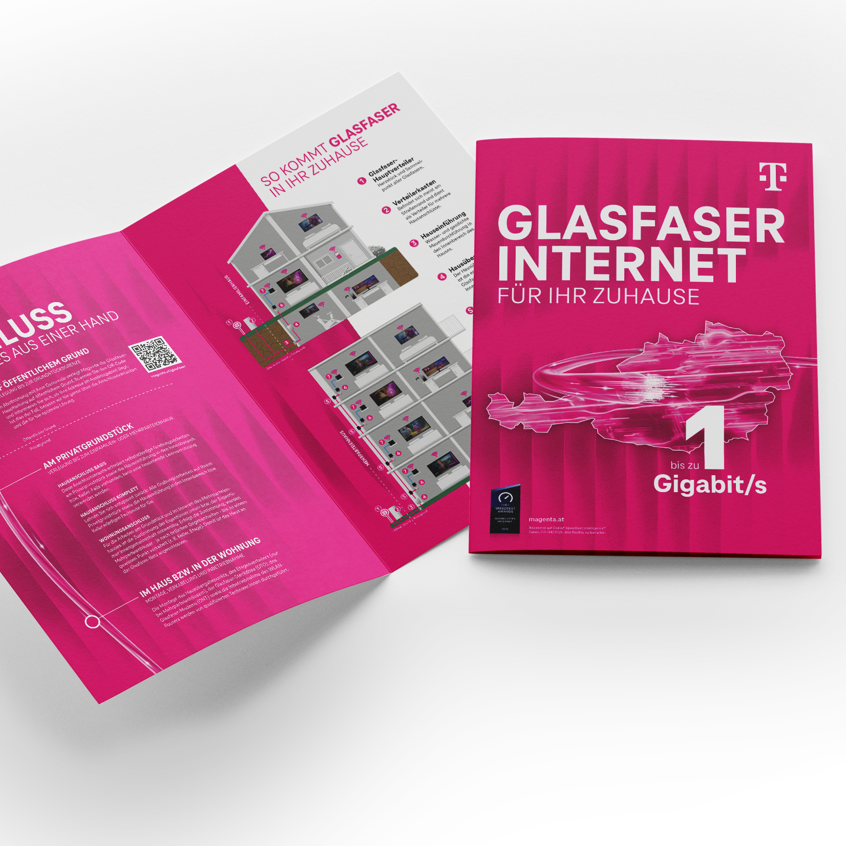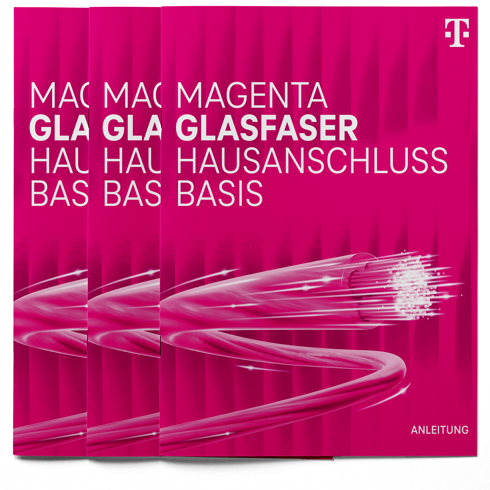 Gedruckte Installationsanleitung für den Magenta Glasfaser Hausanschluss Basis. Die hochwertig produzierte Broschüre (Drahtheftung, 170‑g‑Papier) erklärt alle Schritte von der Außenverrohrung bis zur Inneninstallation.